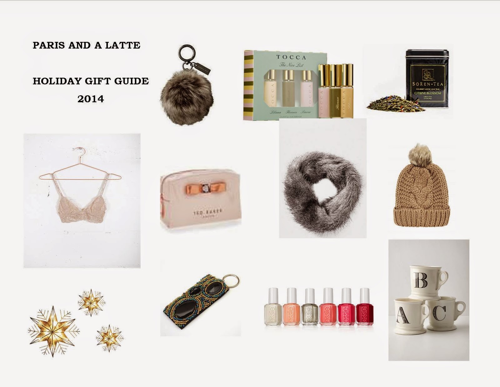 BR fur pom pom keychain // Tocca perfume set // Soren Tea Citrine Blossom Green Tea // Parc Boutique Lace Bralette // Ted Baker cosmetic bag // Faux Fur Snood // Top Shop Cable Knit Beanie // Cayetano Legacy Collection handed beaded keychain // Essie Winter Collection // Anthropologie Monogram Mug